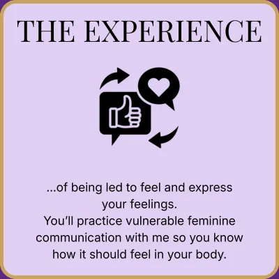 Beyond grateful to have learned about the femininity and how to communicate my feelings, needs, and desires. After this, I learned how to communicate, trust, and let myself be pursued.