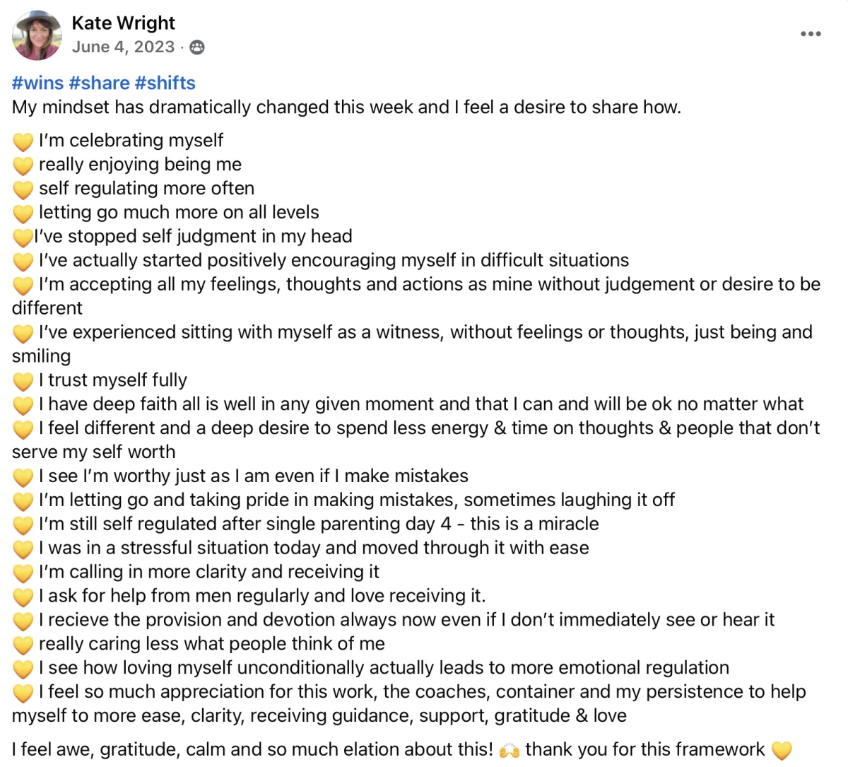 "...My mindset has dramatically changed. I feel awe, gratitude, calm, and so much elation about this work..."